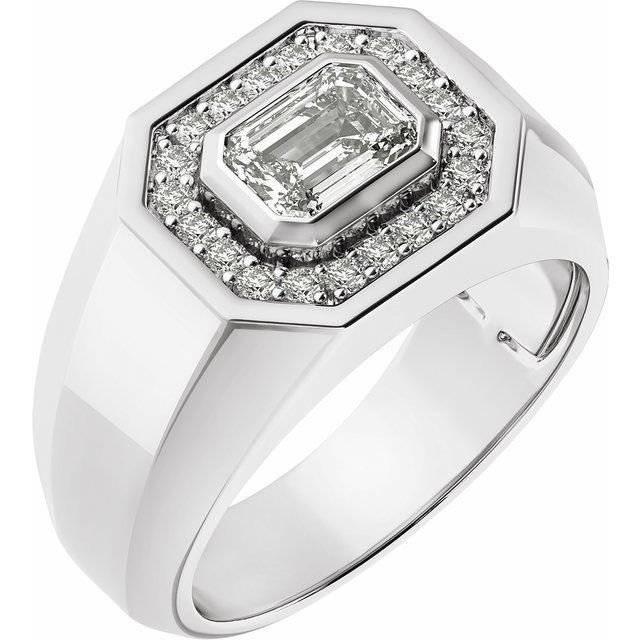 14K white gold men’s band featuring a 1 1/4 CTW lab-grown diamond with SI clarity and H+ color, including a 7×5 mm emerald-cut center stone. The ring has a comfort-fit interior, polished surface finish, and hollow construction. It weighs approximately 6.98 DWT (10.86 grams), has a 5 mm shank base width, 1.8 mm shank base thickness, and is designed in a size 10, which can be customized to the customer’s size.
