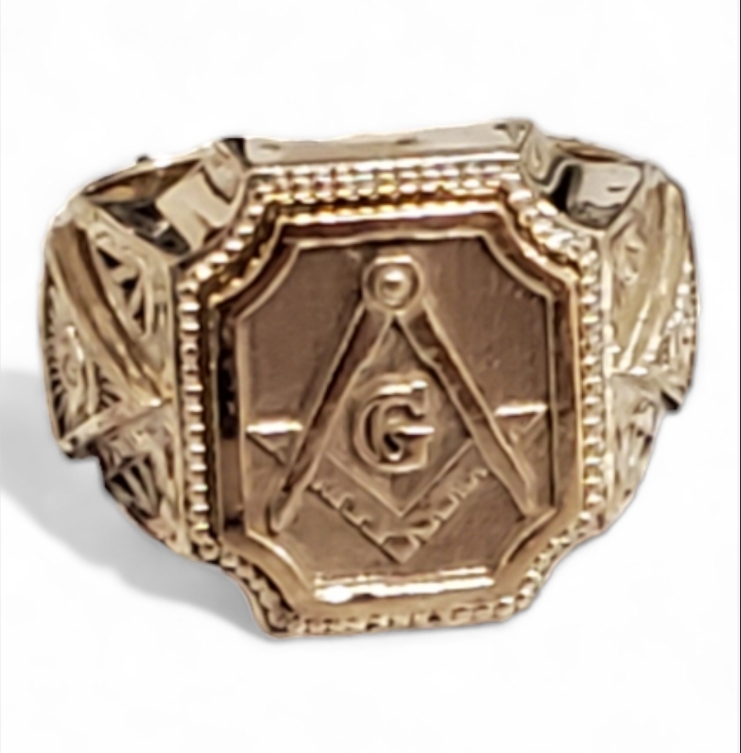 11mm x 9mm. Blue Lodge Freemason symbol 14k yellow gold ring. Designed for everyday use. Made in USA.
